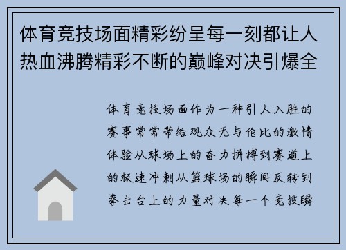 体育竞技场面,作为一种引人入胜的赛事,常常带给观众无与伦比的激情体验。从球场上的奋力拼搏到赛道上的极速冲刺,从篮球场的瞬间反转到拳击台上的力量对决,每一个竞技瞬间都充满了悬念和看点。每一次激烈的角逐,都是对运动员体能和智慧的极限挑战,同时也引发了现场观众的巨大热情与共鸣。在这些体育巅峰对决中,体育精神与竞技魅力得以完美展现,激发了无数观众的心跳与呐喊。本文将从四个方面详细探讨体育竞技场面如何在每一刻都引发热血沸腾,精彩不断。首先,从竞技表现的精彩瞬间入手,分析运动员如何通过出色的技艺和临场发挥震撼全场;其次,探讨赛事氛围对激发观众热情的重要性,如何让每一个瞬间都充满悬念;接着,从观众互动与情感共鸣的角度分析体育赛事的特殊魅力;最后,体育赛事中的不可预测性与紧张感如何将观众的情绪推向高潮。通过这四个方面的剖析,我们将更全面地理解体育竞技场面如何做到精彩纷呈、引爆激情。